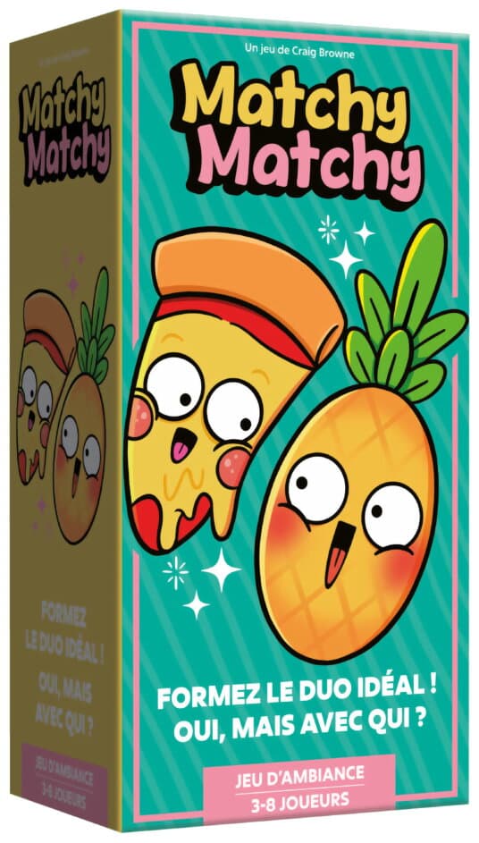 Testez votre compatibilité avec Matchy Matchy ! Dans ce jeu d'ambiance délirant, formez des duos et tentez de prouver que vous êtes sur la même longueur d'onde. À chaque tour, un thème est révélé (cinéma, vacances, conquête...). Chaque joueur doit alors sélectionner secrètement 5 images parmi les 42 de son paquet qui illustrent le mieux ce thème. Comparez ensuite vos choix avec votre partenaire : plus vous avez d'images en commun et plus elles sont dans le même ordre, plus vous progressez vers la victoire ! Simple, rapide et générateur de quiproquos savoureux, c'est le jeu idéal pour découvrir si vous connaissez vraiment vos proches.