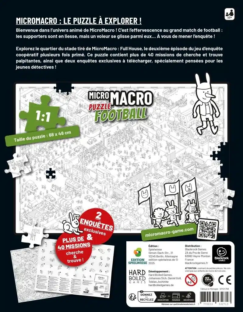Micro Macro - Puzzle Football est d'abord un puzzle de 500 pièces à assembler dans l'univers délirant de MicroMacro. C'est l'effervescence au grand match de football : les supporters sont en liesse, mais un voleur se glisse parmi eux ... À vous de mener l'enquête !