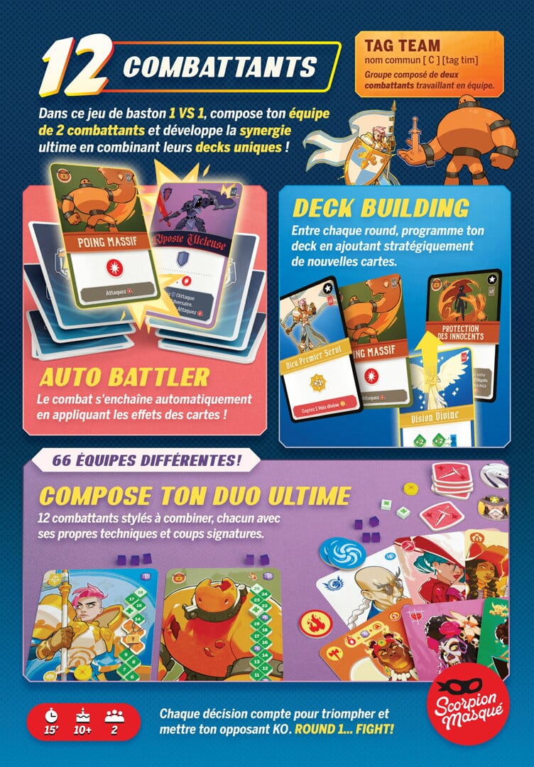 Inspirée par les jeux de combat d'arcade classiques, Tag Team est un auto battler combiné à un jeu de construction de deck. Faites votre équipe de 2 combattants et construisez une synergie imbattable en combinant leurs 2 decks uniques! Chaque personnage a ses propres techniques et ses mouvements spéciaux.